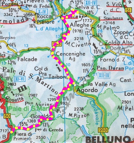 Giro d’Italia Feeling kam am nächsten Tag auf. Auf den Spuren des diesjährigen Giro führte die Tour über den Passo di Cereda nach Agordo. Die Weiterfahrt auf den Passo Duran wurde durch Regengüsse vereitelt. Auf nassen Straßen ging es über Caprile hinauf nach Selva di Cadore. Bereits am Abend war die Sicht wieder frei auf den Monte Pelmo und die umliegenden Dolomitengipfel.